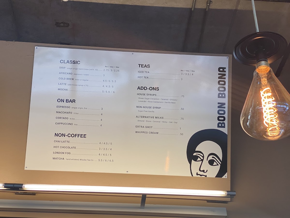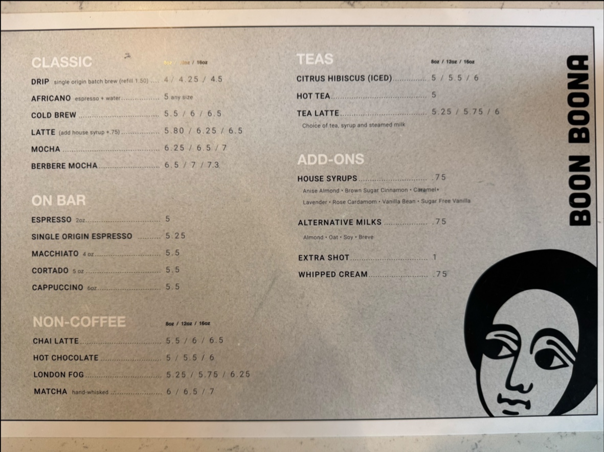 At Boon Boona Coffee Menu, you'll discover a blend of rich flavors and high-quality brews that bring out the best in every sip. Nestled in the heart of Seattle, this cozy coffee spot offers a selection of unique beverages that cater to every taste. Whether you're a fan of a smooth espresso, a bold pour-over, or something more adventurous, Boon Boona has something for you. The carefully crafted menu includes hand-selected beans from around the world, each bringing its own distinctive profile. With a focus on community and quality, it's the perfect place to enjoy your coffee, whether you're on the go or sitting back to savor the moment. With such a warm and inviting atmosphere, the Boon Boona Coffee Menu is bound to make you want to come back for more.